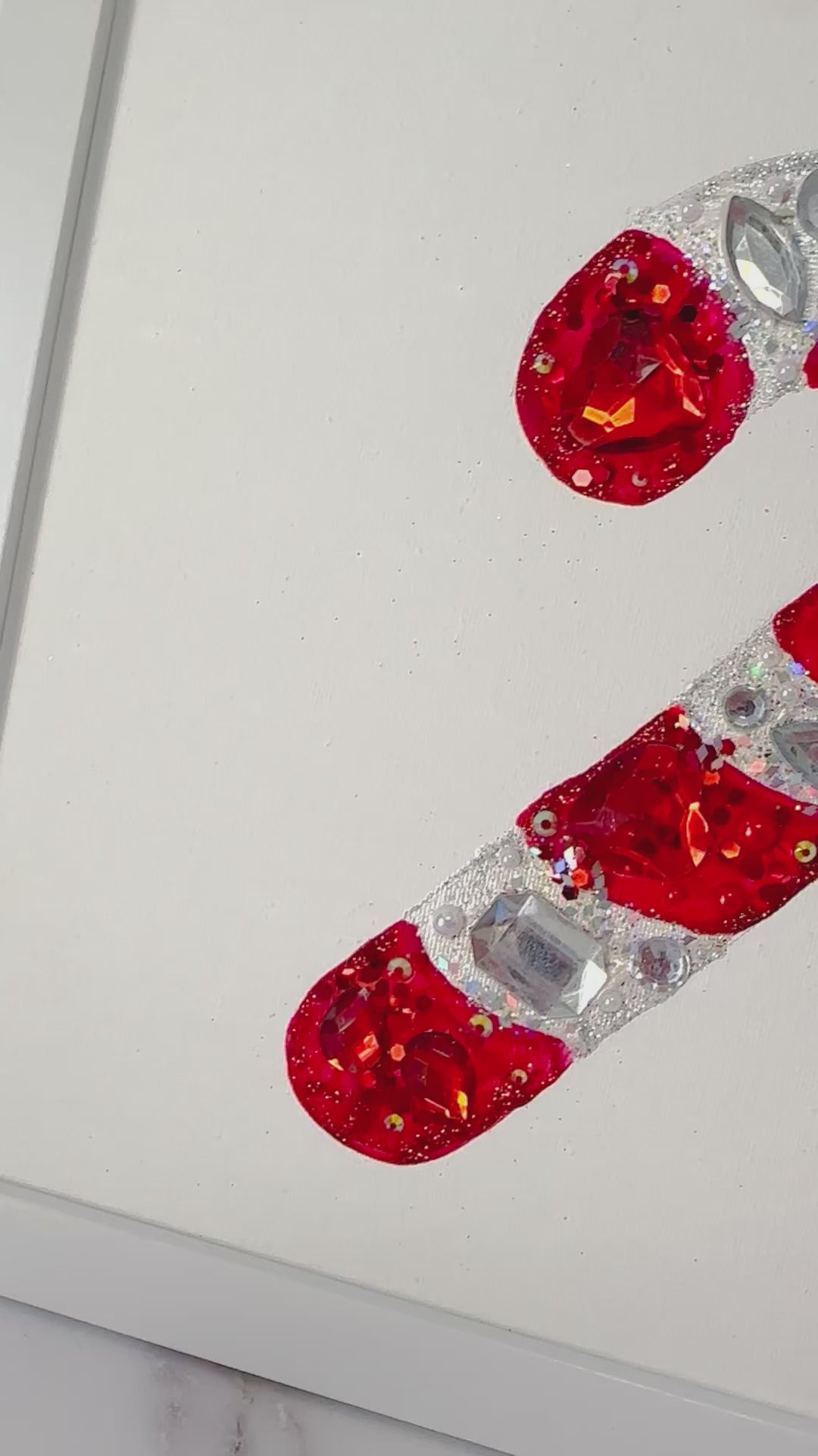 Add a touch of holiday sparkle to your home with this hand-painted candy cane canvas panel. Featuring a vibrant red and white candy cane design, each piece is adorned with dazzling glitter accents and rhinestone embellishments, making every painting truly one of a kind. Perfect for your Christmas home décor or as a thoughtful gift for someone who loves festive decorations, this artwork is framed in a sleek white frame for a polished look that’s ready to display.