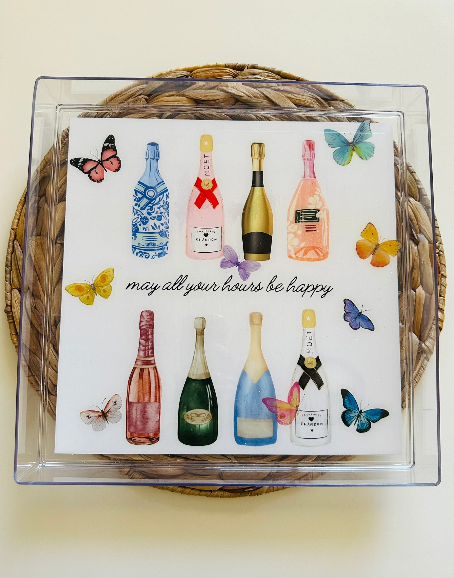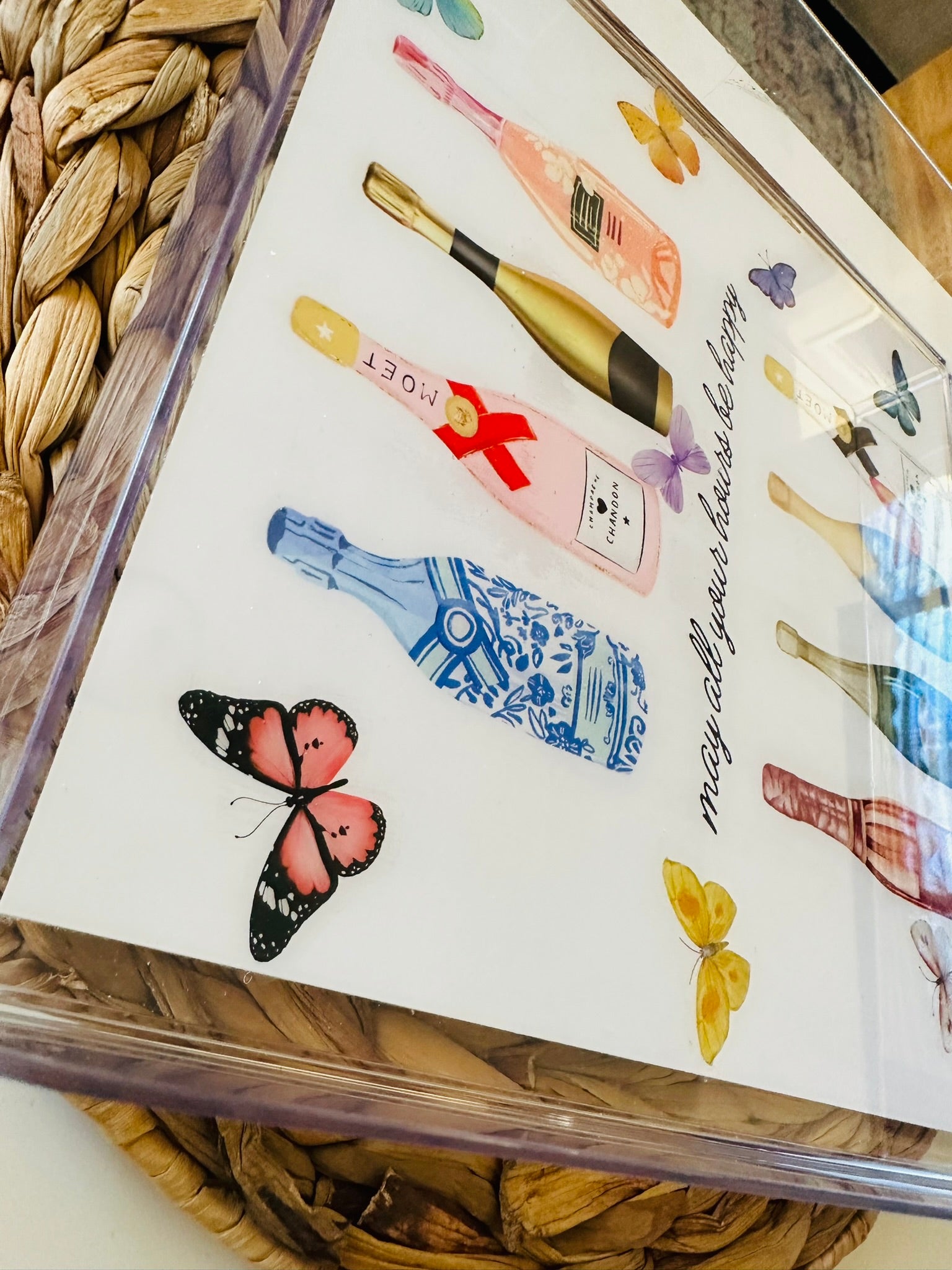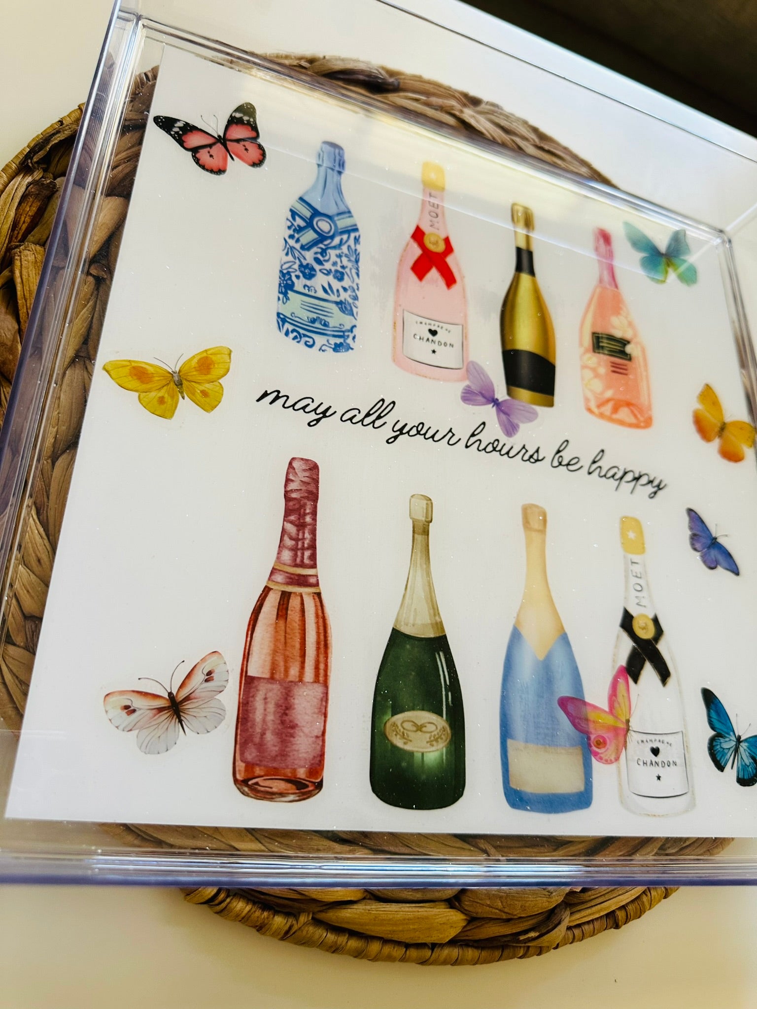 A fun, colorful and unique addition to your home! An original art print featuring all different types of champagne bottles with the phrase "May all your hours be happy" and a flock of beautiful butterflies!