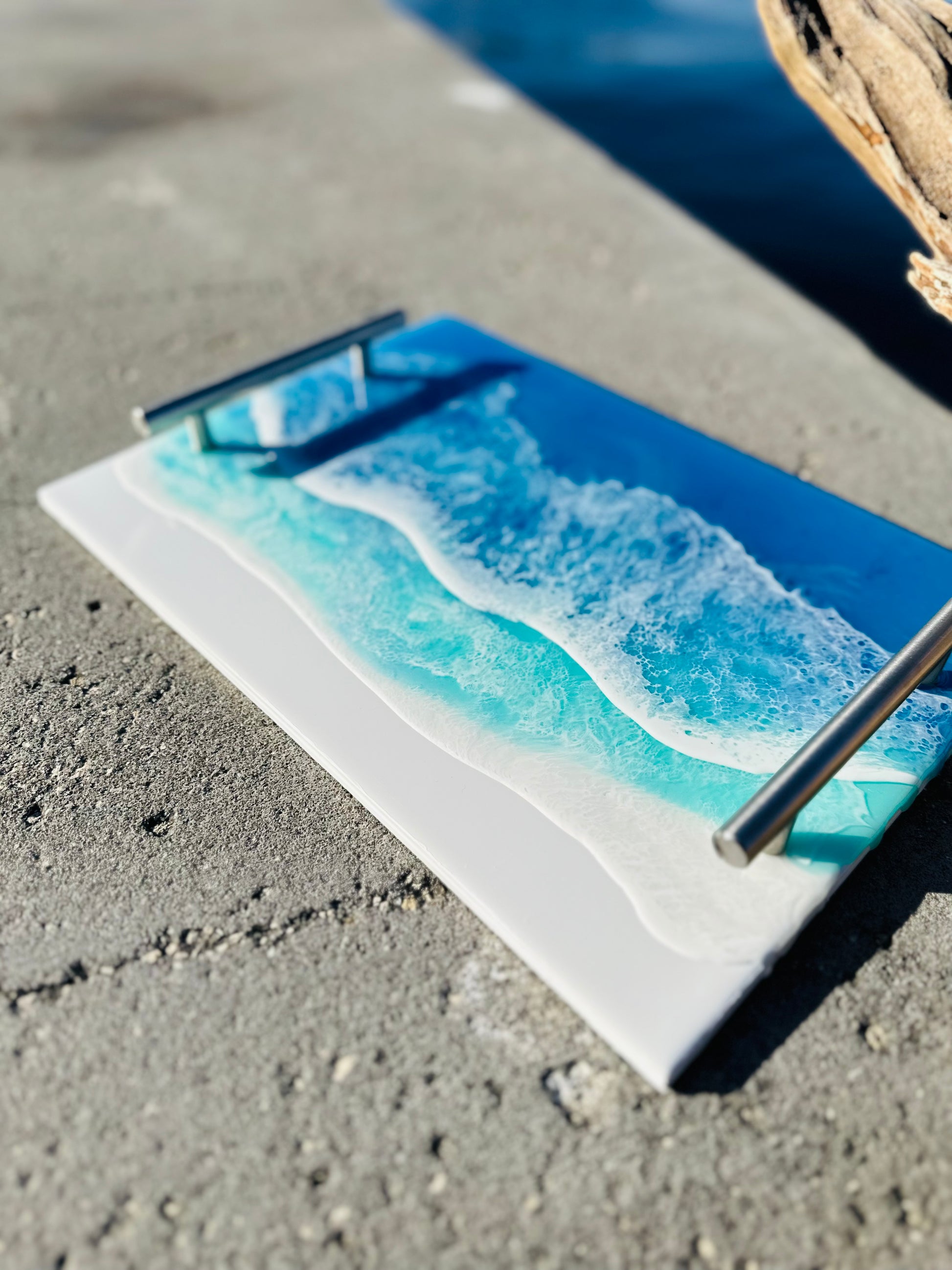 This handcrafted beauty combines the serenity of the sea with functional elegance. Measuring a generous 14" x 10", it features a large ceramic subway tile adorned with swirling waves and vibrant hues, making each piece a unique work of art. Two silver handles add a touch of coastal charm, giving it a practical yet playful vibe.