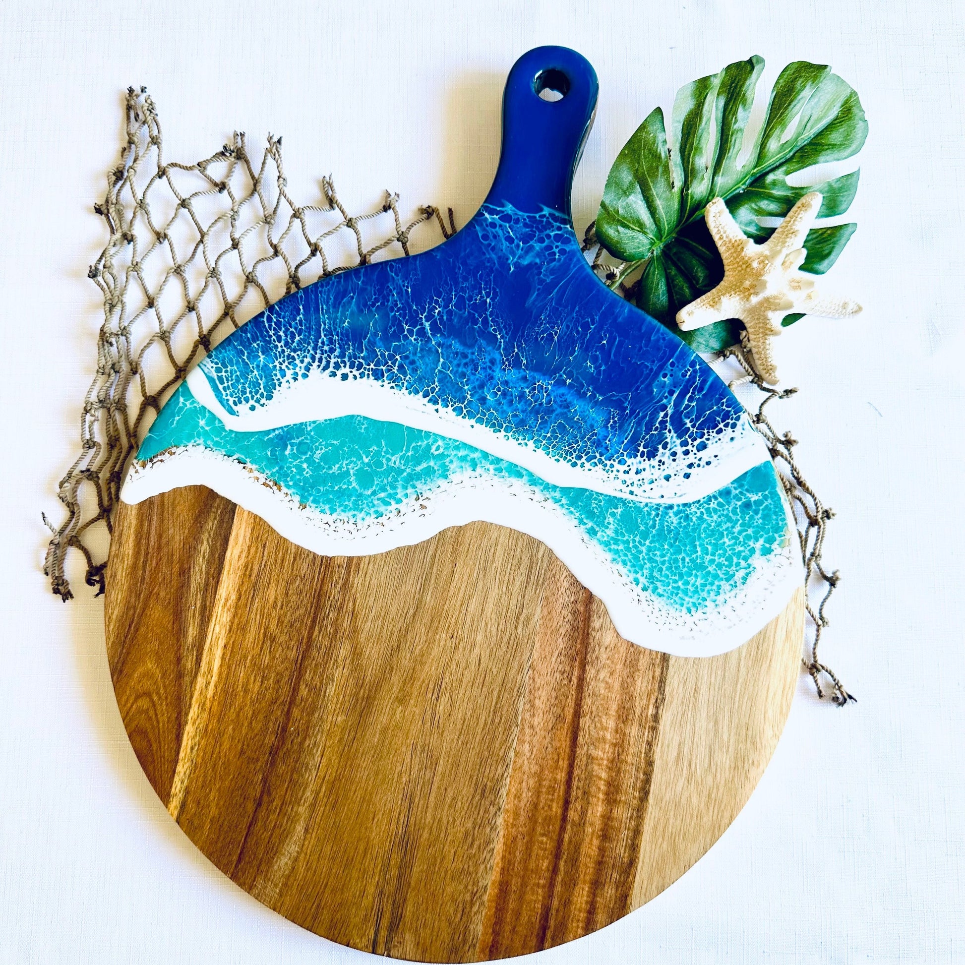Bring coastal charm to your kitchen with this stunning round wooden cutting board, featuring a beautifully crafted epoxy resin ocean wave.